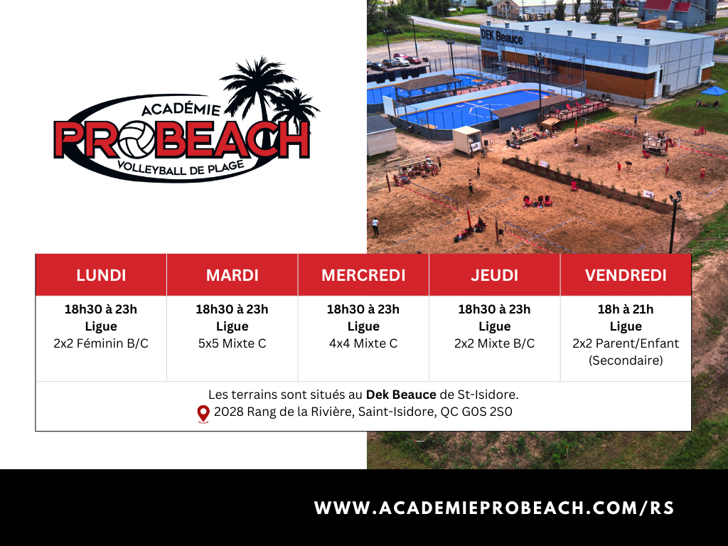 Les ligues peuvent être annulées en cas d’intempéries (orages, froid). La ligue a lieu malgré la pluie. Pour savoir si une soirée est annulée, il y aura une publication sur la page Facebook de l’Académie ProBeach – Québec, dans le cas échéant, à 17h et une notification sur MyTeam.Click.